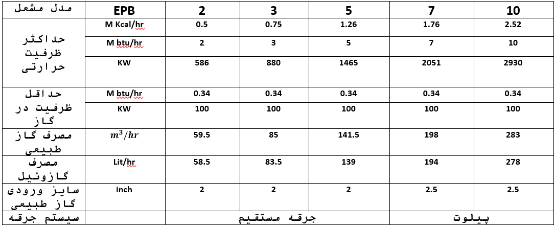 مشعل جت فشار EPB در سه مدل دونازله، مدولار مکانیکی و مدولار با سیستم کنترل احتراق میباشد. این مشعل جهت نصب بر روی دیگهای بخار فایرتیوب ؛آب داغ؛روغن داغ و کوره های خشککن به کار می رود که دارای ربع ظرفیت 220الی2930 KW میباشد.